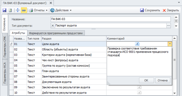 - содержание (значение) параметров аудита заносится в поле «Комментарий» атрибутов документа.