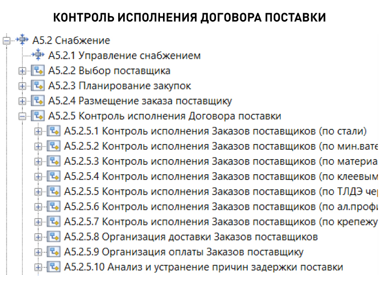 При моделировании бизнес-процесса «Контроль исполнения договора поставки» эксперты отмечали, что все семь типов договоров контролируются совершенно по-разному, за них отвечают разные специалисты, поэтому будет семь совершенно разных бизнес-процессов контроля исполнения заказов поставщиков (по типам договоров).