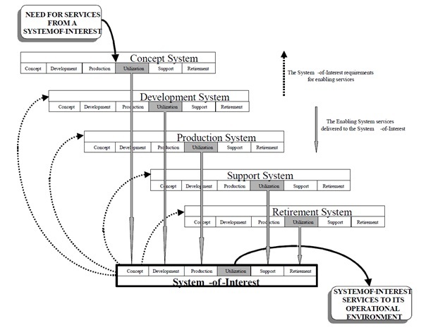 Стадии жизненного цикла отражают следующую идею: «Шаги разработки новой системы можно рассматривать как постепенную „материализацию“ системы — постепенный переход от абстрактной потребности к сборке и монтажу пригодных к работе компонентов, совместно выполняющих сложные функции ради удовлетворения данной потребности» [А.Косяков «Системная инженерия», с.143]. Нужно понимать, что это упрощенное изображение реального протекания стадий, которые в реальности могут накладываться во времени друг на друга, чередоваться (например, функционирование системы и ее обслуживание)