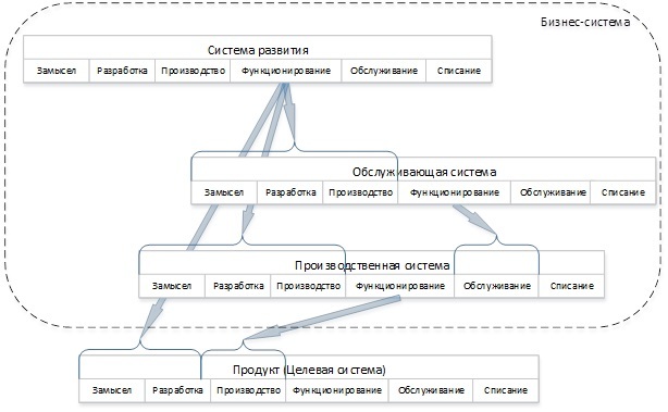 На схеме я отразил тот факт, что Система тиражирования бизнесов частично участвует в замысливании Продукта и Производственной системы. Если замысел оканчивается успешно, то она создает Систему развития, которая продолжает работу по созданию