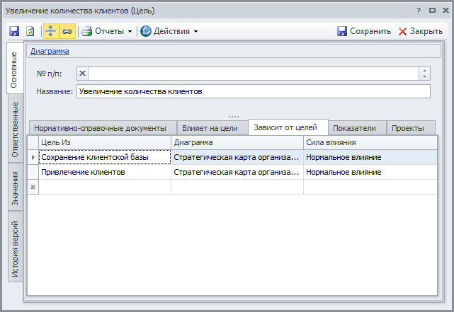 Внимание! Сила влияния должна быть одинаковой во всех связях одного показателя с одной целью (например, связь показателя и цели может присутствовать на разных стратегических картах). В случае, если силы влияния в нескольких связях одного и того же показателя с одной и той же целью будут отличаться, расчет оценки достижения этой цели будет некорректным. Для расчета оценки достижения цели будет использоваться весовой коэффициент первой связи в списке одинаковых связей одного показателя с одной целью.