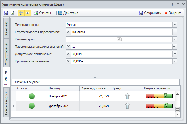 Ознакомитесь, пожалуйста, с параметрами показателей, представленными на вкладке Значения.