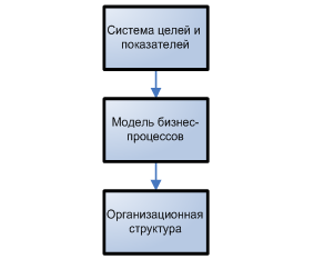 Управлять - значит приводить объект управления в целевое состояние. Исходя из этого определения, можно выделить основные элементы системы управления организацией. Организация управляет целым рядом объектов управления (подробнее о них будет сказано ниже). Целевое состояние объектов управления задает система целей и показателей, деятельность по приведению объектов управления в нужное состояние описывается с помощью модели бизнес-процессов, исполнители этой деятельности определяются организационной структурой (Рис. 1).
