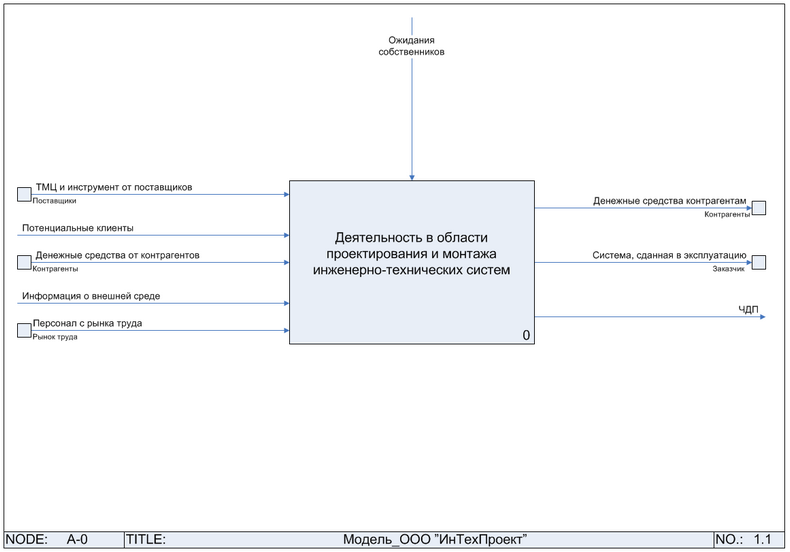 Контекстная диаграмма. Самая верхняя диаграмма, на которой объект моделирования представлен единственным блоком с граничными стрелками. Эта диаграмма называется A-0 (А минус нуль). Стрелки на этой диаграмме отображают связи объекта моделирования с окружающей средой. Диаграмма A-0 устанавливает область моделирования и ее границу. Пример диаграммы A-0 приведен на Рис. 1.