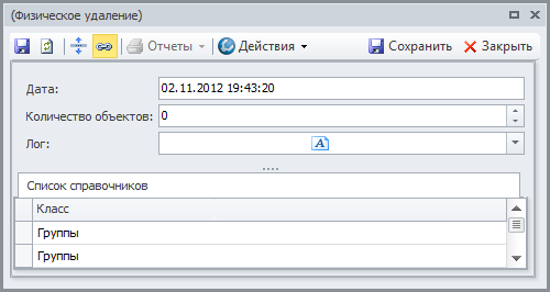 В журнале физических удалений фиксируются сведения о физическом удалении помеченных объектов из базы данных: дата и время операции удаления, количество успешно удаленных из базы объектов, список классов, из которых не были удалены помеченные объекты.