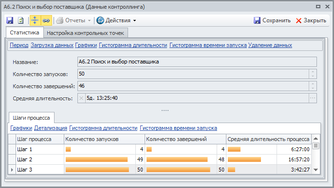 После того, как для процесса настроены контрольные точки, можно выполнять загрузку статистических данных. Для этого в окне свойств данных контроллинга процесса на вкладке Статистика нажмите на гиперссылку Загрузка данных.
