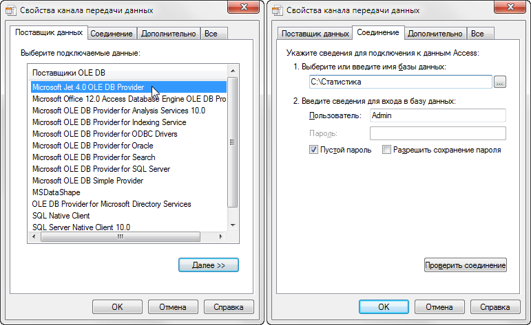 Если источником данных является csv-файл, то в окне Свойства связи с данными (Рис. 5) на вкладке Поставщик данных выберите "Microsoft Jet 4.0 OLE DB Provider".