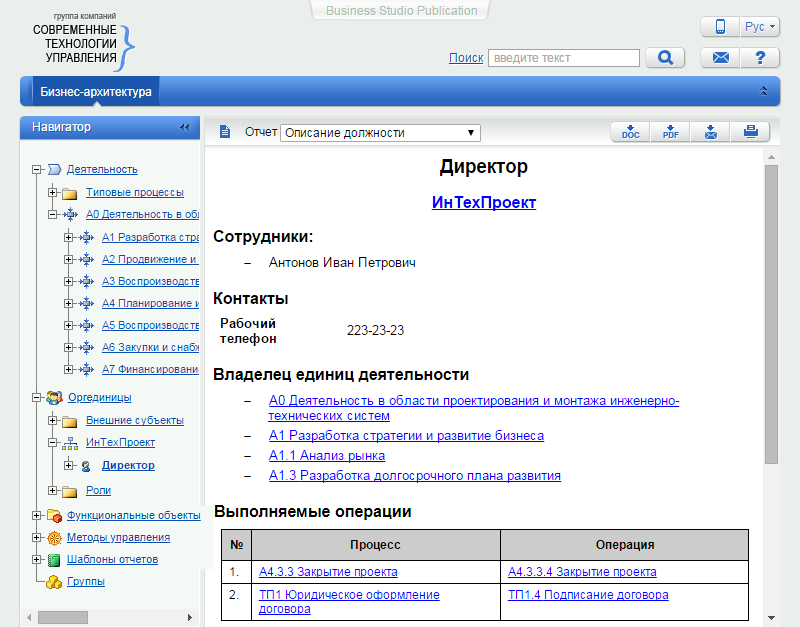 Ключевая возможность HTML-публикации − переход между документами. Каждый объект системы в HTML-публикации представлен гиперссылкой (Рис. 1), в том числе и приложенные к объектам Business Studio внешние файлы (например, формы документов в формате MS Word).