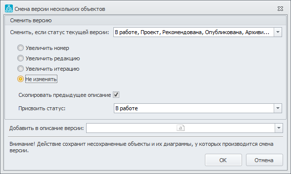 С помощью Окна смены версии нескольких объектов (см. Рисунок 1) осуществляется изменение версий сразу нескольких объектов.