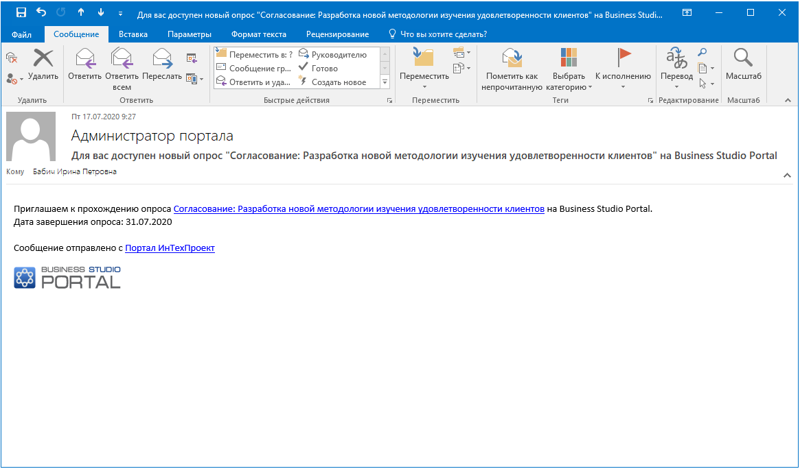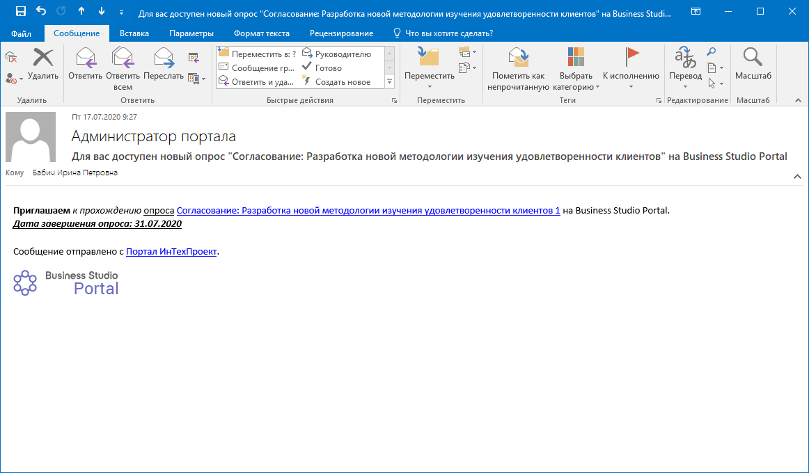 После формирования отчетов по объектам опроса респонденты получают уведомления о необходимости пройти опрос с ссылкой на страницу опроса (см. Рисунок 6).
