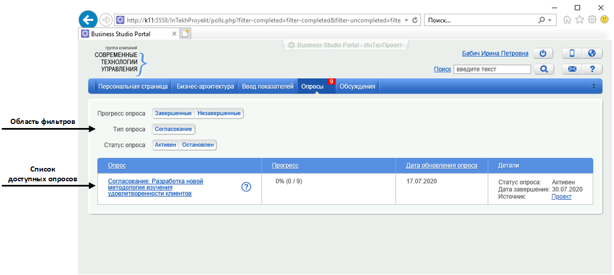 Список доступных пользователю опросов находится в разделе Опросы портала (см. Рисунок 7). Индикатор в Главном меню на кнопке раздела показывает количество объектов опросов, по которым пользователю необходимо предоставить ответ.