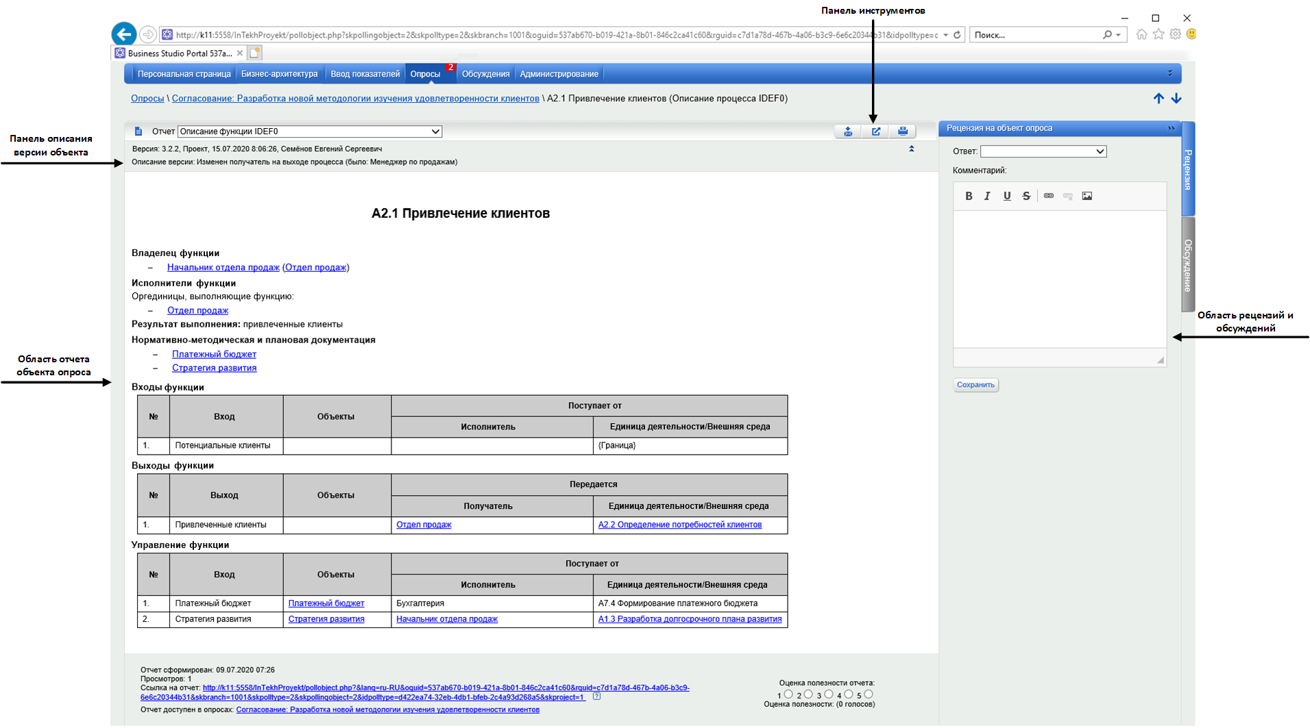 Из отчета объекта опроса можно переходить по гиперссылкам на другие объекты. При этом область Рецензия/Обсуждение остается активной для текущего объекта опроса. Текущий объект опроса всегда можно увидеть в ссылке "хлебные крошки" под главным меню.