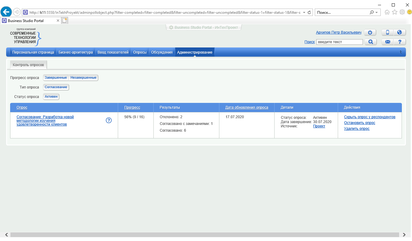 | Тестовая эксплуатация | Тип опроса, предназначенный для проведения тестовой эксплуатации бизнес-архитектуры на ограниченном списке сотрудников. |