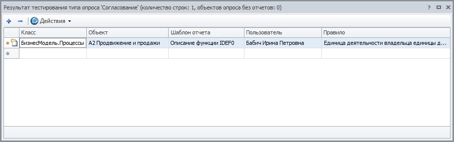 В появившемся окне выбирается справочник, папка, группа объектов или конкретный объект. Результат выполнения теста опроса выводится в соответствующем окне. В примере на Рисунке 21 показано, что при выполнении теста опроса "Согласование" от единицы деятельности "А2 Продвижение и продажи" получен пользователь "Бабич Ирина Петровна".