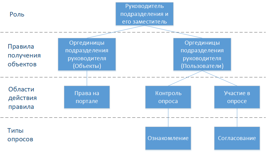 Правило "Оргединицы подразделения руководителя (Объекты)" предназначено для предоставления прав на портале. Правило "Оргединицы подразделения руководителя (Пользователи)" предназначено для получения объектов в опросе и контроля опроса. Для областей действия правила определены типы опросов, на которые они распространяются.