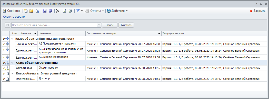 Аналитик для единиц деятельности А2 и А2.3, оргединицы Отдел продаж и документа Договор установил новые версии 1.0.1 со статусом «В работе», а также создал новую единицу деятельности А.2.5 с теми же номером версии и статусом. Результат работы по данному этапу приведен на Рисунке 3.