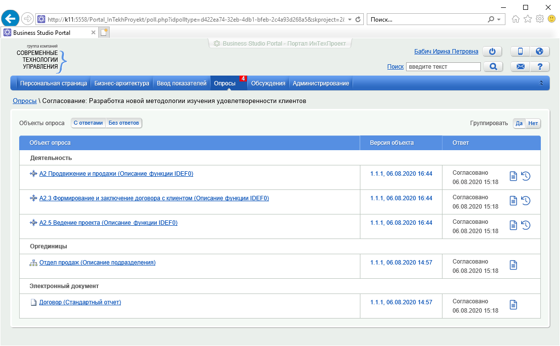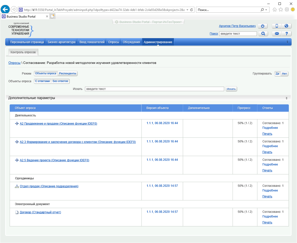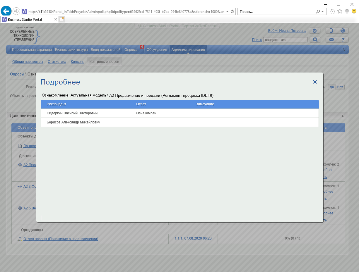 Аналитик контролирует ход опроса и просматривает полученные ответы на вкладке Контроль опросов раздела Администрирование. На Рисунке 6 показано, что только один из двух участников согласования оставил рецензии на объекты опроса.