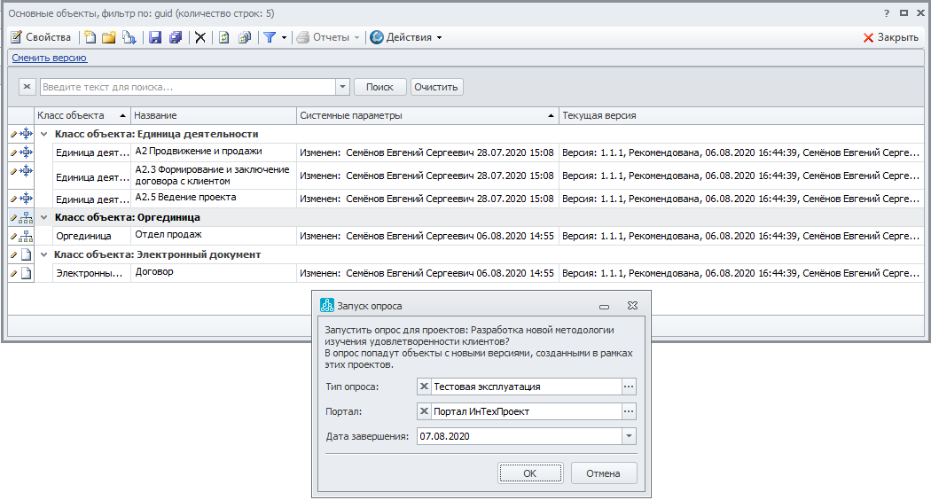 Пример. Аналитик установил версиям единиц деятельности А2, А2.3 и А2.5, оргединице Отдел продаж и документу Договор статус "Рекомендована", и запустил опрос "Тестовая эксплуатация". Номера версий объектов при этом остались без изменений (см. Рисунок 7).