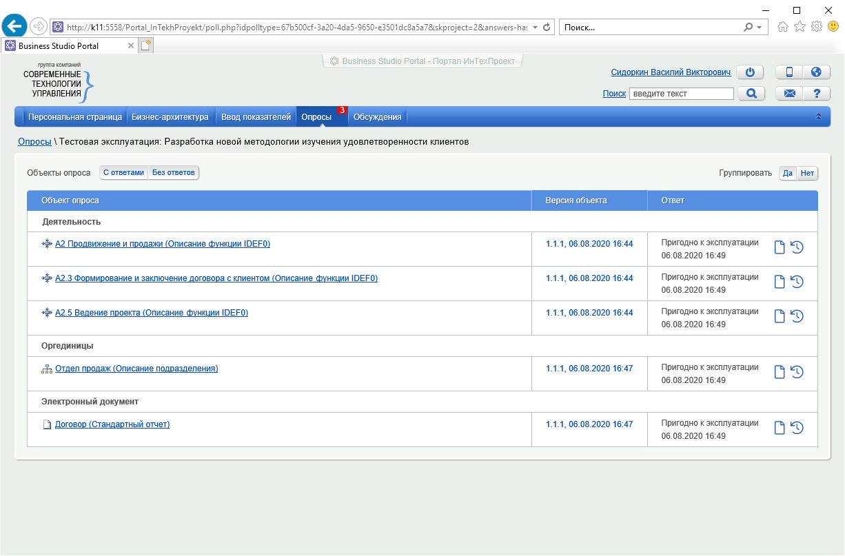 Респонденты-участники тестовой эксплуатации (Сидоркин Василий Викторович и Борисов Александр Михайлович) после получения уведомлений открывают страницу опроса и по каждому объекту оставляют рецензии о пригодности к эксплуатации его в новой бизнес-архитектуре (см. Рисунок 8).