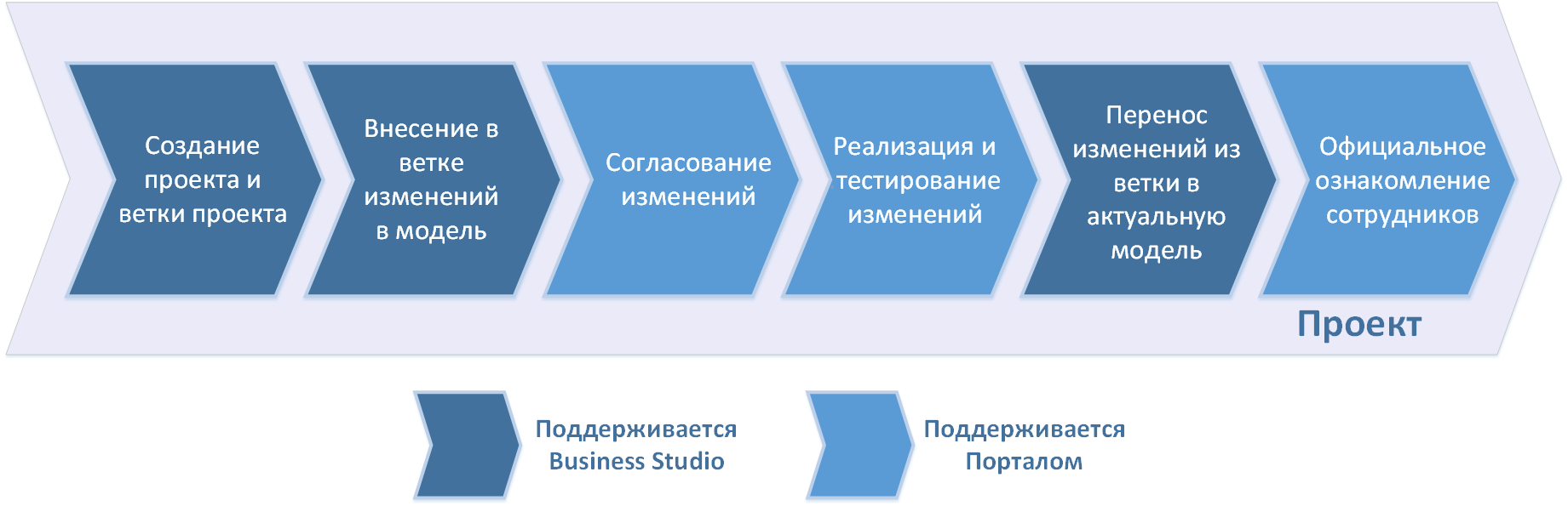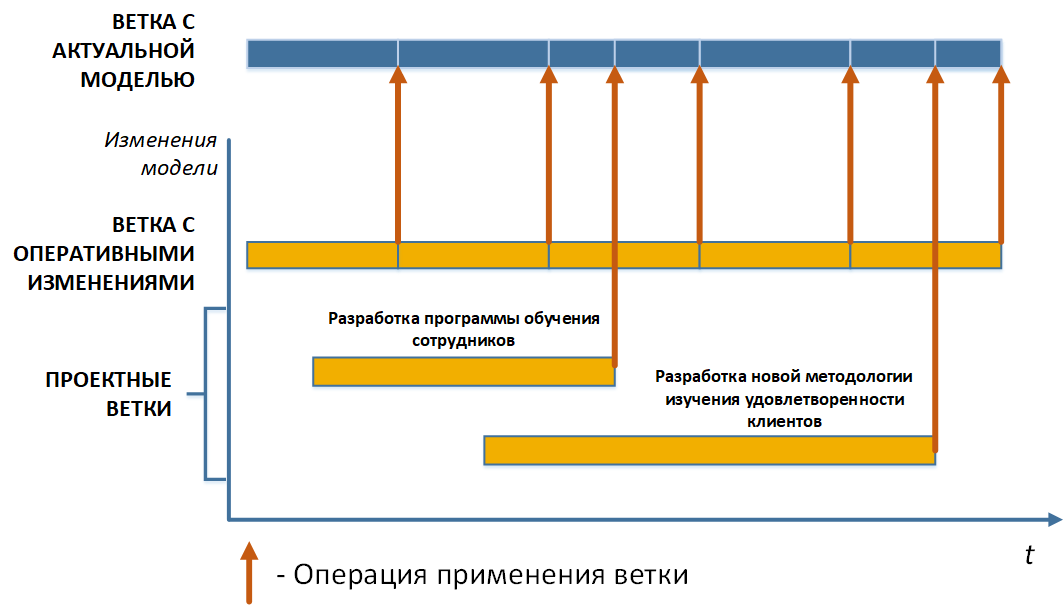 В данной главе описан один из возможных подходов к управлению жизненным циклом модели. Изменение бизнес-архитектуры компании может осуществляться в режиме оперативных изменений или в проектах, занимающих длительное время. На Рисунке 1 показан возможный жизненный цикл актуальной модели с учетом подготовки изменений в отдельных ветках и последующей их заливкой в актуальную модель:
