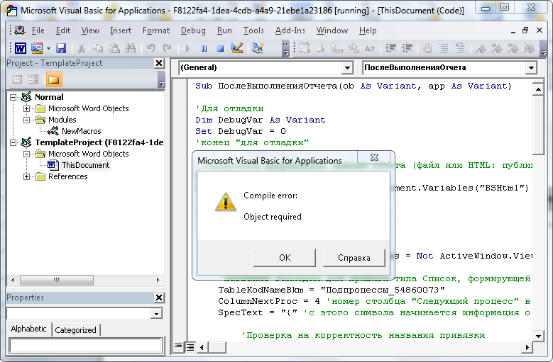 При выполнении макроса будет выдано сообщение об ошибке на фоне еще одного окна среды VBA. К этой ошибке привел вышеуказанный код.
