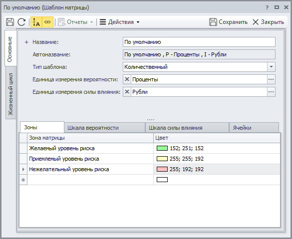 Матрица рисков строится на основе шаблона матрицы. Шаблон матрицы создается в одноименном справочнике (Главное меню → Риски → Шаблоны матрицы), где выбирается тип шаблона (качественный или количественный), настраиваются цвета зон матрицы (рис. 1).