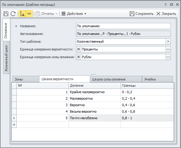 Далее настраиваются шкалы вероятности и силы влияния (рис. 2). Для качественного шаблона матрицы значения шкал задаются в баллах, а для количественного – указываются числовые значения делений шкалы.