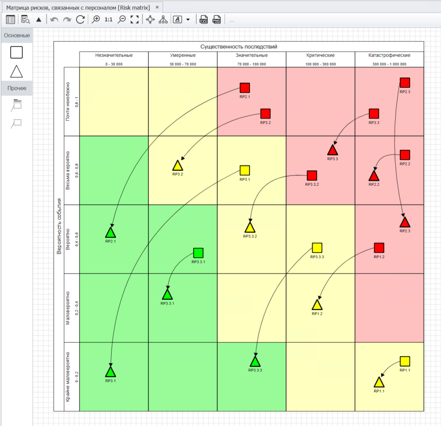 Матрицы рисков создаются в одноименном подразделе раздела Управление рисками на вкладке Методы управления в Навигаторе. При создании матрицы для нее автоматически выбирается шаблон, указанный в параметре Шаблон матрицы по умолчанию (Главное меню → Риски → Параметры риска). При открытии диаграммы на ней уже расположена матрица. Добавление рисков на диаграмму осуществляется либо с палитры, либо из Навигатора. При этом на диаграмму добавляется либо присущая оценка риска, либо остаточная. Оценка риска автоматически располагается в ячейке матрицы, которая определяется по координатам оценки. Присущая и остаточная оценки риска могут быть связаны при помощи коннектора. По умолчанию, для каждой оценки указывается код риска, при необходимости можно выбрать стиль диаграммы, который отобразит названия всех рисков. Пример матрицы рисков приведен на рисунке 4.