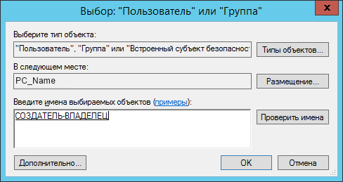 2) Добавим пользователя "СОЗДАТЕЛЬ-ВЛАДЕЛЕЦ" по кнопке Добавить в окне Права на объект Словарь стрелок. В открывшимся окне необходимо выбрать пользователя "СОЗДАТЕЛЬ-ВЛАДЕЛЕЦ" (данный пользователь присутствует в системе по умолчанию) и указать размещение на локальной рабочей станции (на скриншоте PC_Name – имя вашей локальной рабочей станции)