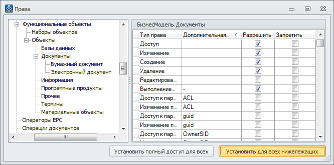 Также нужно добавить право на доступ к окну Окно свойств класса "Документы". Для этого развернуть ветку "Окна → Окно редактирования → Окно свойств объекта → Окно свойств объекта с вкладками", установить флажок "Разрешить" для типа права "Доступ", нажать на кнопку Установить полный доступ для нижележащих. Группа вертикальных прав создана.