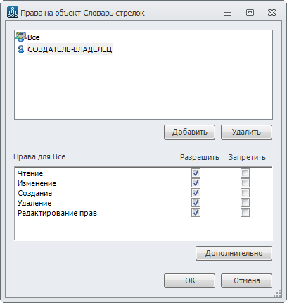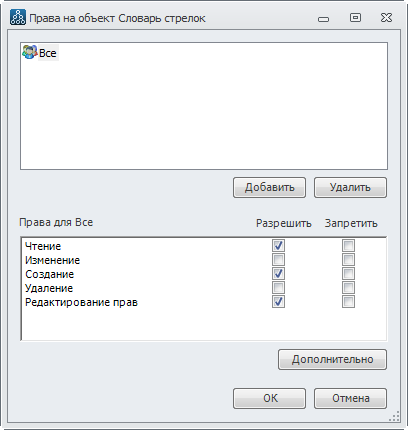 1) В окне Права на объект Словарь стрелок необходимо снять разрешение прав "Изменение" и "Удаление" для группы пользователей "Все". По умолчанию, права унаследованы от родителя объекта и нет возможности их отредактировать. Снимем опцию наследования прав. Для этого необходимо нажать на кнопку Дополнительно, в открывшемся окне Дополнительные права на объект Словарь стрелок нужно снять флажок Наследовать от родительского объекта применяемые к потомкам права, добавляя их к явно заданным в этом окне, на вопрос о копировании наследуемых прав ответить Да. Нажать на кнопку OK. Теперь опции Разрешить стали доступными для редактирования. Снимем лишние опции таким образом, чтобы остались включенными только опции разрешения прав на "Чтение", "Создание" и "Редактирование прав" (Рис. 4).