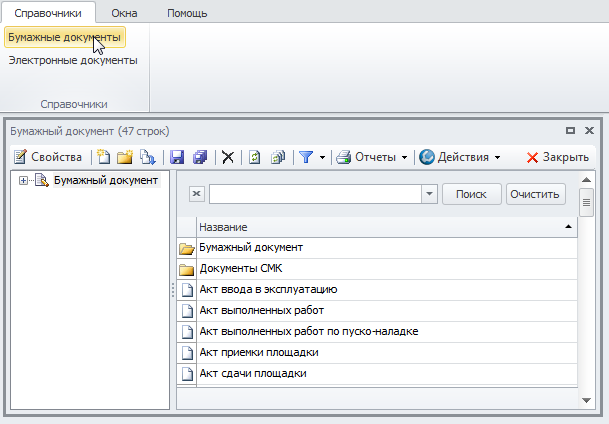 В справочнике администрирования "Меню пользователя" необходимо создать меню. Например, создать папку "Меню редактора документов" − она будет соответствовать группе меню. Добавить в ней папку "Справочники" − это будет пункт главного меню. Добавить в нем элемент "Бумажные документы" − это будет пункт меню. Заполнить параметры: "№" − "1"; "Название" - "Бумажные документы"; "Действие" - "Показать справочник"; "Аргумент" - выбрать класс "Бумажный документ" (Рис. 2). По гиперссылке Выполнить меню можно проверить работу пункта меню. Выбором пункта меню будет открываться форма списка "Бумажный документ". Аналогично добавить пункт меню "Электронные документы". Подробное описание дано в Mеню пользователя.