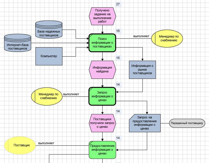 При запуске пошаговой имитации из Окна диаграммы единицы деятельности во время имитации рамкой выделяются фигуры диаграммы, обозначающие точки, где в текущий момент имитации находятся токены. Для каждой фигуры операции отображается количество завершенных экземпляров имитирующих операций. На диаграмме процесса в нотации Flowchart дополнительно отображается количество запущенных экземпляров имитирующих событий. На диаграмме процесса в нотациях ЕРС и BPMN дополнительно отображается количество запущенных экземпляров имитирующих событий и операторов. (Рис. 5).