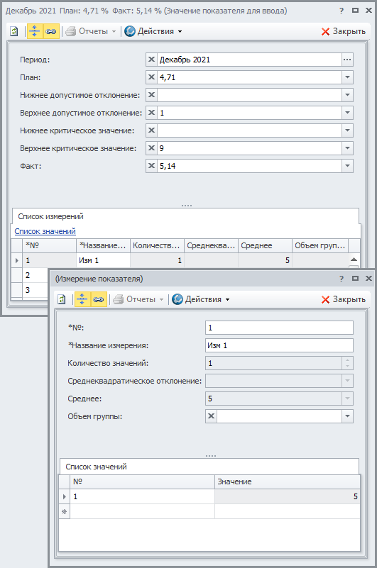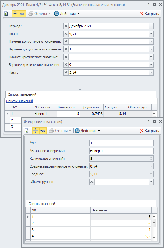 Для построения контрольной карты показателя необходимо предварительно произвести измерения показателя и внести их в соответствующий список − список измерений. Его можно увидеть в Окне свойств значения показателя. Для этого необходимо выделить на вкладке Значения показателя (Окно свойств показателя → вкладка Значения) тот период, за который будут осуществляться измерения, и нажать на гиперссылку Список измерений (Рис. 3), либо открыть Окно свойств от выделенной строки при помощи пункта Открыть свойства строки в контекстном меню строки.