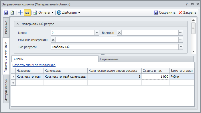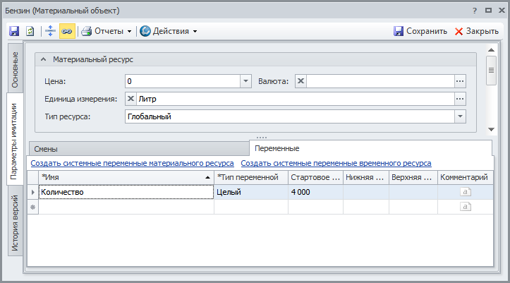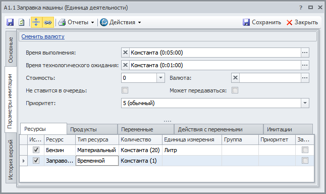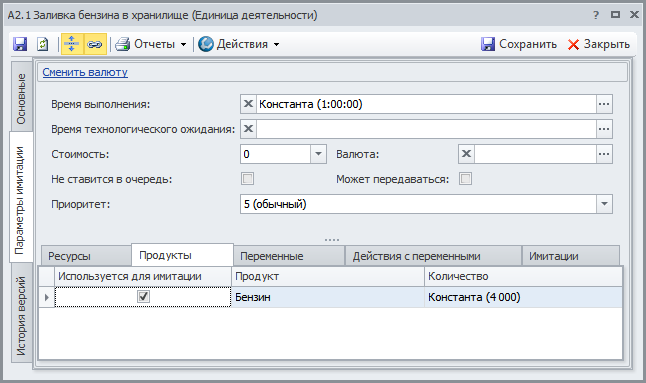 Создаем два объекта в справочнике "Функциональные объекты": "Бензин" и "Заправочная колонка". В Окне свойств этих объектов на вкладке Параметры имитации задаем параметры в соответствии с Рис.1 и Рис.2.