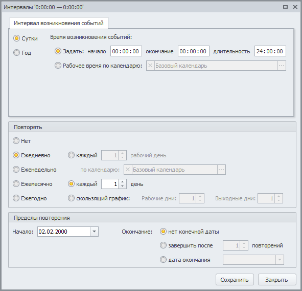 Настройки Интервала возникновения экземпляров стартового события будут одинаковыми для всех трех правил возникновения экземпляров стартового события (Рис.7):