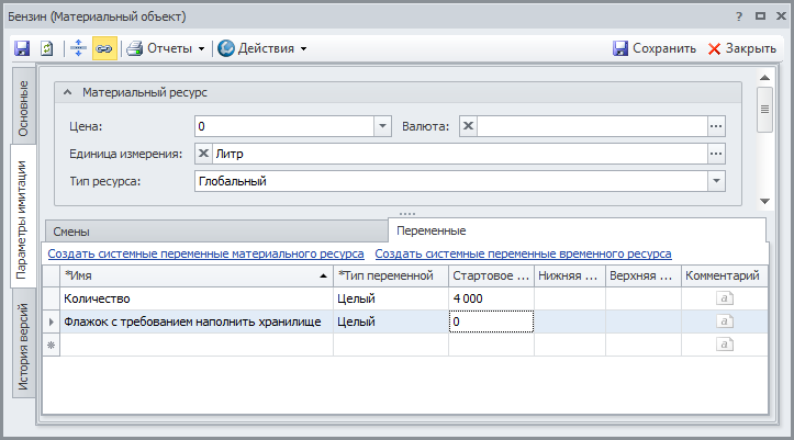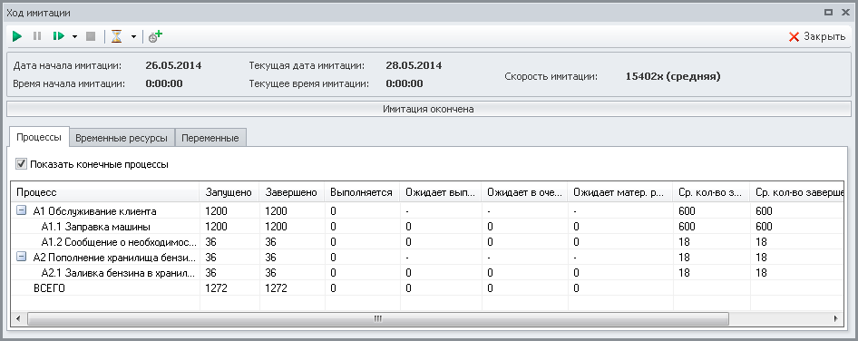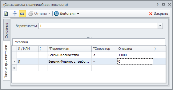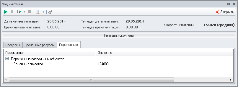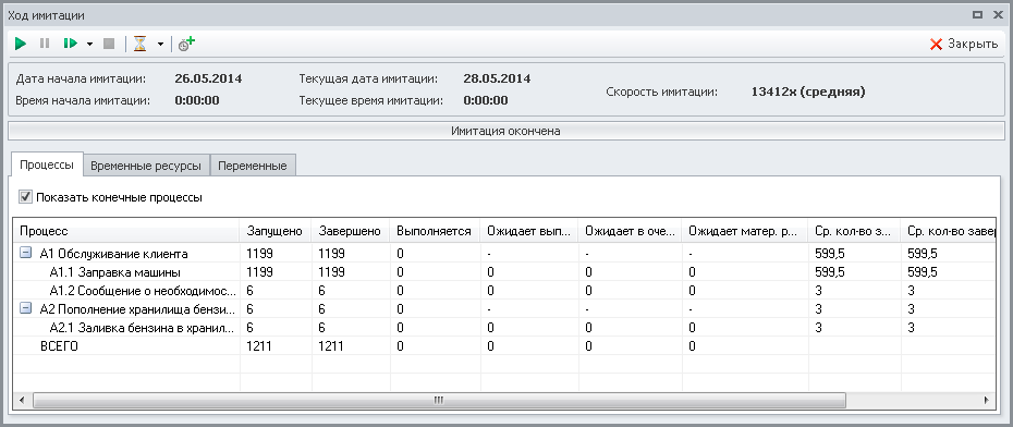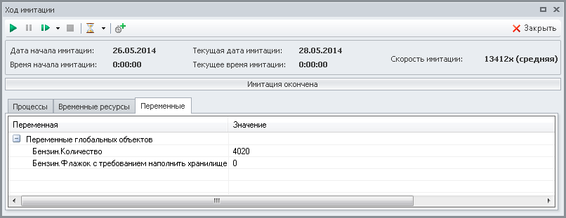 Таким образом, мы модифицировали модель. Теперь как только значение экземпляра переменной "Количество" имитирующего материального ресурса "Бензин" становится меньше 1000 литров, запускается на выполнение экземпляр имитирующего процесса "Пополнение хранилища бензина" и меняется значение экземпляра переменной "Флажок с требованием наполнить хранилище". Новые экземпляры имитирующего процесса "Пополнение хранилища бензина" не будут запускаться до тех пор, пока значение экземпляра переменной "Флажок с требованием наполнить хранилище" не вернется в начальное состояние и не станет равным 0.