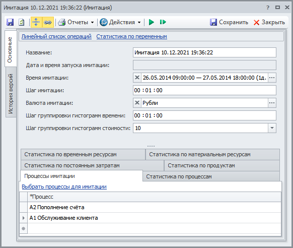 Запускаем имитацию двух моделей процессов «Обслуживание клиента» и "Пополнение хранилища бензина". В Окне свойств имитации задаем параметры в соответствии с Рис.15:
