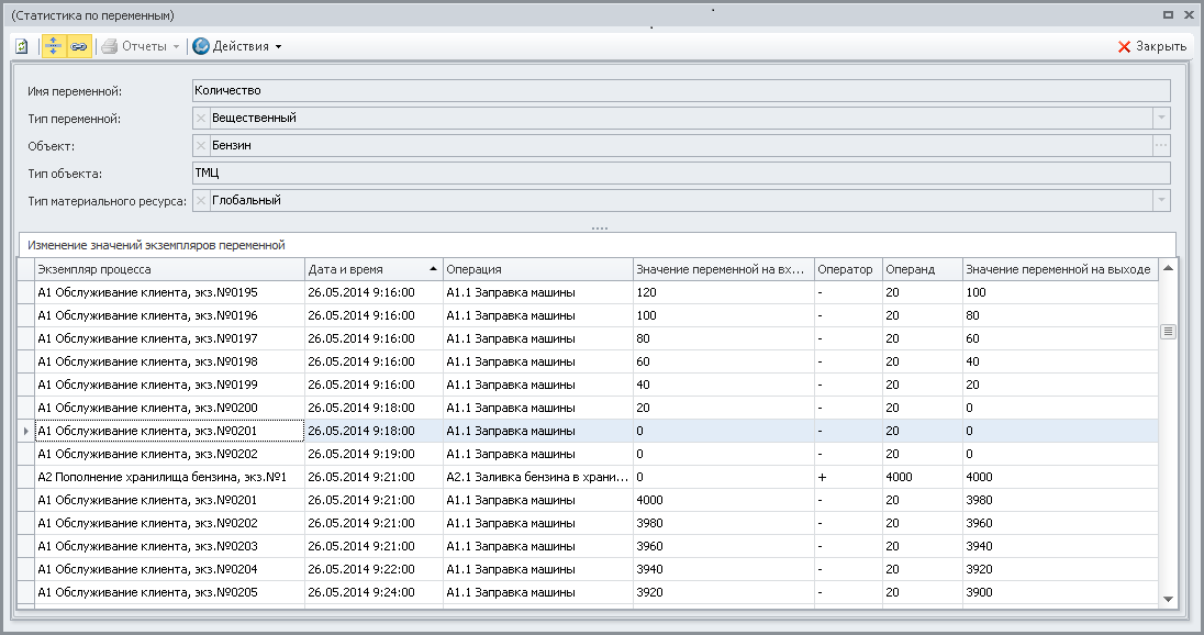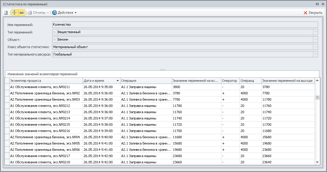 Динамику изменения значений экземпляра переменной "Количество" имитирующего материального ресурса "Бензин" проанализируем в Окне свойств имитации по гиперссылке Статистика по переменным (Рис.25):