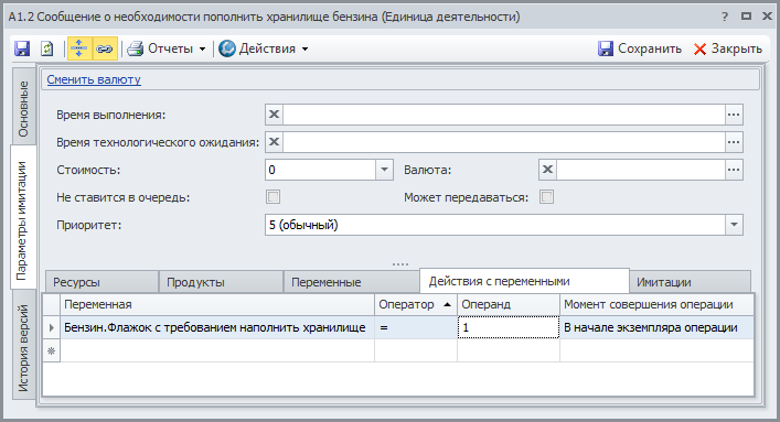 В Окне свойств объекта "Заливка бензина в хранилище" справочника "Деятельность" на вкладке Действия с переменными также зададим действие, которое во время имитации необходимо совершить с экземпляром переменной «Флажок с требованием наполнить хранилище» (Рис.21):
