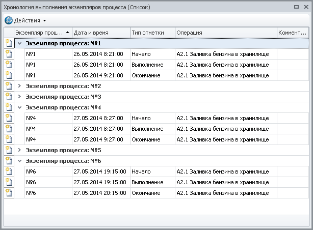 Для того чтобы выяснить причины такого большого значения экземпляра переменной "Количество", перейдем на вкладку Процессы и проанализируем количество экземпляров имитирующей операции "Заливка бензина в хранилище" (Рис.17). Очевидно, что количество запущенных экземпляров данной имитирующей операции также слишком велико.