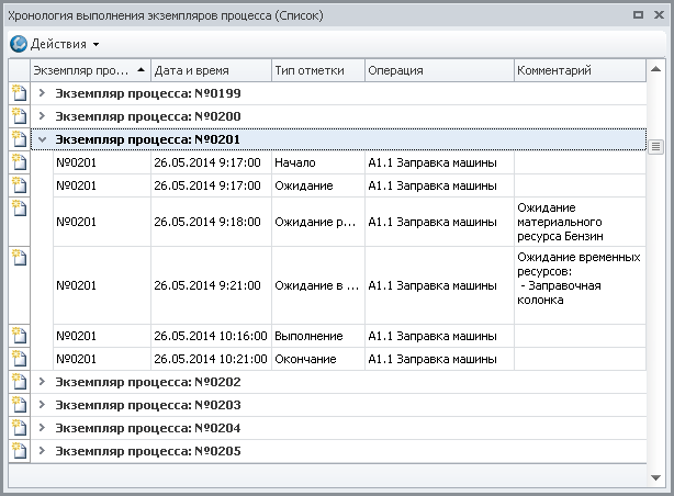 Проанализируем хронологию выполнения одного из таких экземпляров имитирующей операции, например, экземпляра под номером 201 (Рис.28). Количество экземпляров имитирующего процесса "Обслуживание клиента" и экземпляров имитирующей операции "Заправка машины" совпадает, поэтому рассматриваемый нами экземпляр имитирующей операции имеет такой же номер, как и экземпляр имитирующего процесса, номер которого мы видим в окне "Статистика по переменным" в параметре "Экземпляр процесса" - 201.