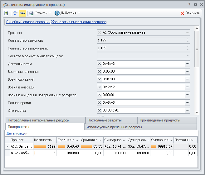 Далее на примере статистики по имитирующему процессу "Обслуживание клиента" проанализируем полученные статистические данные (Рис.29):