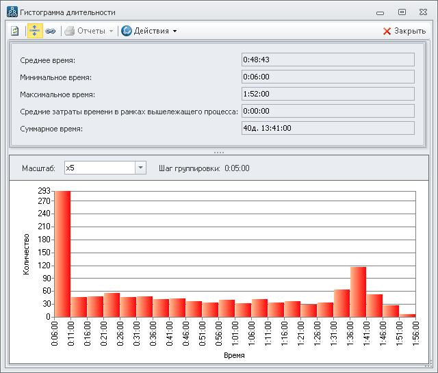 Откроем гистограмму распределения длительностей экземпляров имитирующего процесса "Обслуживание клиента" (Рис.30):