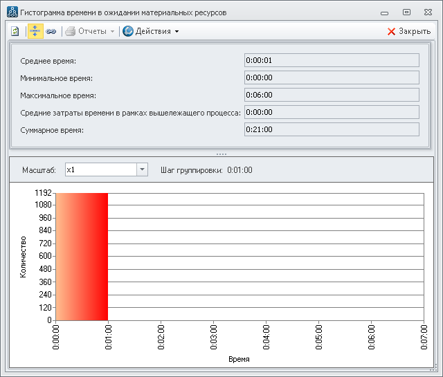 Откроем гистограмму распределения времен, проведенных экземплярами имитирующего процесса "Обслуживание клиента" в ожидании имитирующего материального ресурса "Бензин" (Рис.32):