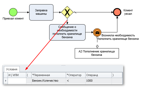 Мы не до конца продумали условия перехода к следующему шагу экземпляра имитирующего процесса "Обслуживание клиента" в точке ветвления (см. Рис.3). По заданным нами условиями получается, что как только значение экземпляра переменной "Количество" имитирующего материального ресурса "Бензин" становится меньше 1000, то каждый новый экземпляр имитирующего процесса "Обслуживание клиента" в точке ветвления запускает выполнение экземпляра имитирующего процесса "Пополнение хранилища бензином". А так быть не должно, это логическая ошибка. Необходимо задать условия таким образом, чтобы запуск экземпляра имитирующего процесса "Пополнение хранилища бензином" осуществлялся только один раз по достижении экземпляром переменной "Количество" значения 1000. И в течение времени выполнения экземпляра имитирующего процесса "Пополнение хранилища бензином" новые экземпляры этого имитирующего процесса не запускались.