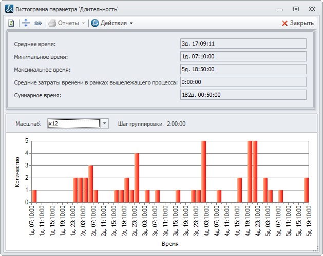 | Среднее время | Среднее значение временного параметра, рассчитанное на основе значений параметров завершенных экземпляров имитирующего процесса. |
