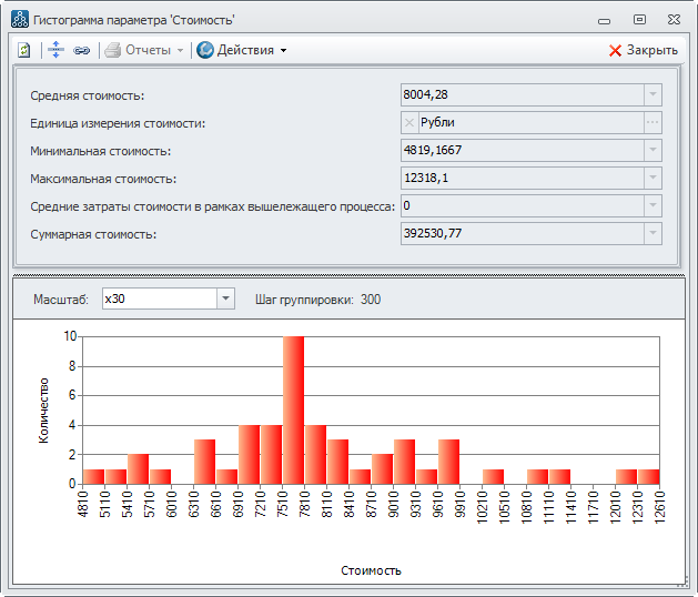 | Средняя стоимость | Среднее значение параметра "Стоимость", рассчитанное на основе значений параметров завершенных экземпляров имитирующего процесса. |