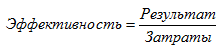 Результатом могут быть любые материальные и нематериальные объекты, например, материальные ценности, услуги, документы или управленческие решения. Наиболее часто результаты можно "измерить" с помощью таких показателей как "количество", "качество". К затратам, в первую очередь, относятся прямые затраты денежных средств. Однако когда невозможно выделить прямые затраты, например, в случае выработки управленческих решений, к затратам можно отнести время, затраченное на принятие решения. Эффективность такой активности оценивается как качество решения, деленное на время его принятия. Чем качественнее принятое решение, тем выше эффективность. Сокращение времени принятия решения при неизменном качестве также приведет к увеличению эффективности.