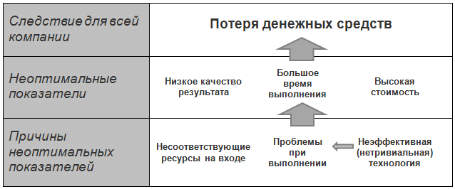 Может быть и так, что используются годные ресурсы, все исполнители выполняют свои шаги на 100% правильно, однако затраты слишком высоки или времена выполнения экземпляров ключевых процессов превышают желаемые значения. В этом случае проблема неэффективности деятельности кроется в плохой технологии.